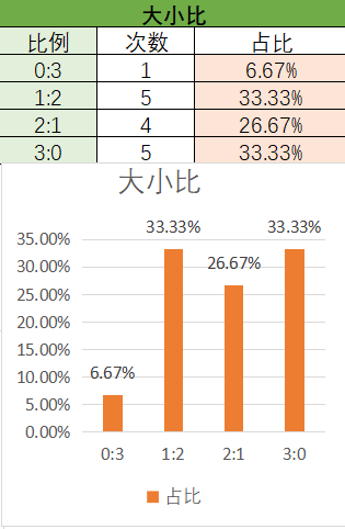 上期大小比为3:0,其中3:0占比变大。2:1占比变小。可以看到近15期内3:0和1:2优势最好的,然后是2:1,最后是0:3。本期看好2:1开出,其次是0:3。