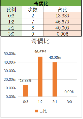 上期奇偶比为1:2,其中1:2占比变大,3:0占比变小。近15期内2:1优势最大,其次是1:2,最后是0:3。上期开了1:2奇偶比,本期看好2:1奇偶比的开出,其次是3:0。