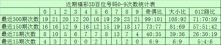 百位分析:最近300期奖号由冷到热表现为:523,325,1226,027,629,933,834,437,740次,奖号奇偶比为147:153,大小比为159141012路比为114:103:83