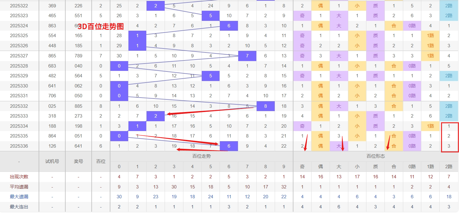 福彩3D百位分析:第2025336期百位开出号码6属于大偶数,从上面百位走势图上可以看出近100期大小比约为54:46奇偶比约为53:47。近期数据还是比较极端的符合文章开头介绍的求均衡规律非等量现象。但这种均衡不会持续最终会被偏态运行打破,然后循环往复。但短期内大小相差6点,小数过热大数有回补需求本期个人认为走大数的概率更高。上期百位落号“6”号球,在百位号码开出0路号码6后向大数方向走出6个振幅。那么通过分析上期百位落位号码分析,号码走出6个振幅,号码走为大偶数,开出0路号码6。通过对百位落号趋势来分析,百位号码落位中端,通过对近10期的走势来看百位号码大小交替频繁走3期大数又走2小数,近期3D百位走势来看,号码3和4已持续多期未出,逐渐形成冷态,冷号回补是必然趋势,尤其当遗漏值达到一定临界点后,其出现概率将显著上升,值得后续重点关注其解冻信号。而号码1作为近期热号,表现活跃,呈现出较强的热度持续性,短期内仍有反复出现的可能,需重点防守其惯性走强。在策略上采取防热追回补的思路,对热号1保持适度关注,避免因追冷而错过热号延续的机会;同时对冷号3和4保持跟踪观察,我们在百位关注的重点在13478这5个号码球上,百位号码近期奇偶切换频繁,6号球码属于0路号码偶数,现偶数开出过多有向奇数的趋势。所以福彩3D第2025337期百位看好13478。本文由一起彩钱是生命动力所著,请勿转载