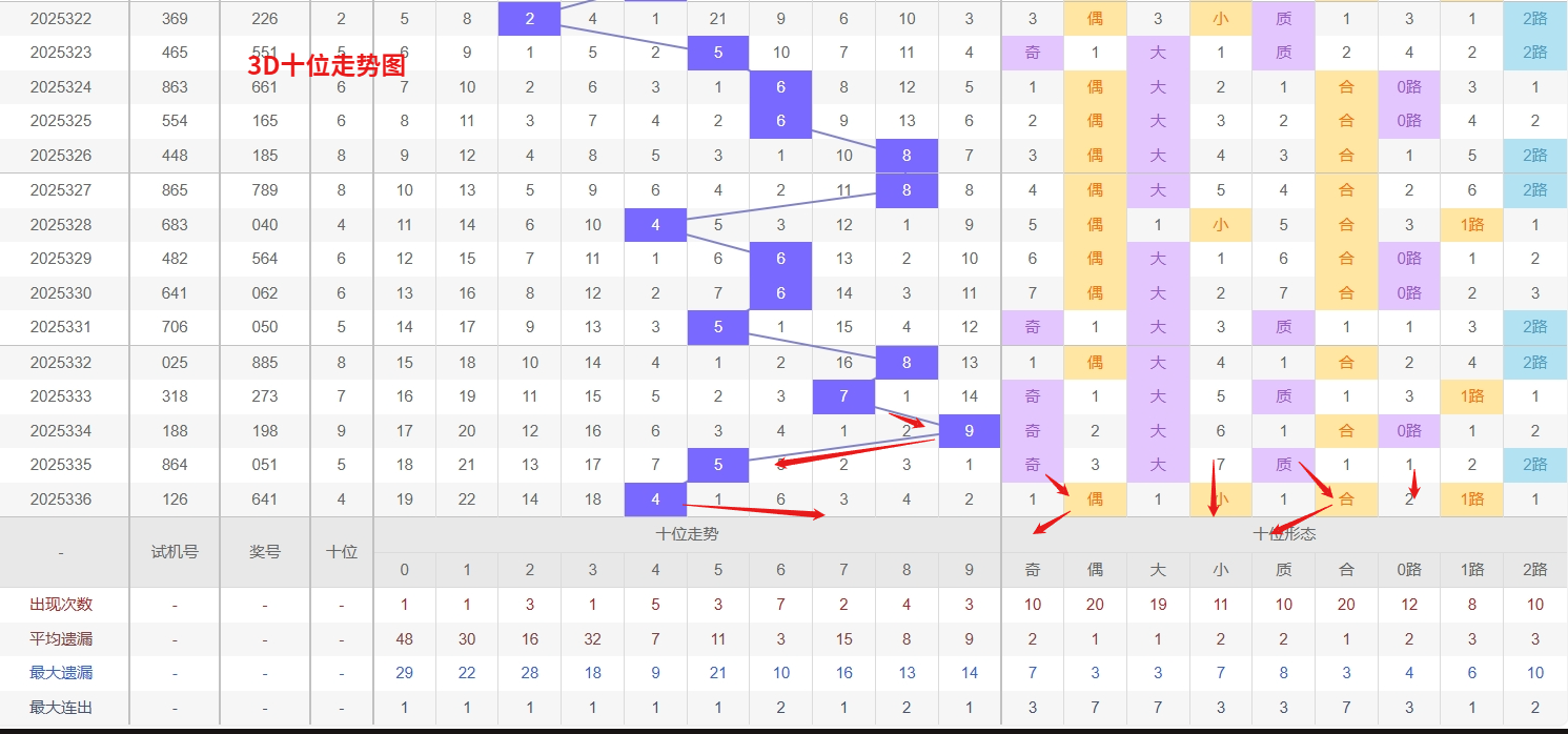 福彩3D十位分析:第2025336期十位开出号码4属小偶数号码中端。以历史100期数据为例十位奇偶比约为45比55,大小比约为51比49近期大小相差1点,根据求均衡的规律开出小数的概率比大数高一点。上期我们分析奇数经过连续回补后有走偶数的可能,开出奖号4小偶数符合我们的预期。近期3D十位走势来看,大数号码活跃度较高,形成明显的热度偏向,但按照大小均衡的波动规律,小数区域已逐渐积蓄回补势能,短期内出现反弹的可能性正在增加。尤其需要注意的是,号码2和3在十位已遗漏较长时间,处于冷态区间,冷号一旦回补往往具有突然性和持续性,需密切防范其解冻开出。与此同时,热号6表现强势,热度集中且走势连贯,从形态和频率上看仍有连开延续的可能,所以福彩3D第2025337期十位推荐23679。本文由一起彩钱是生命动力所著,请勿转载