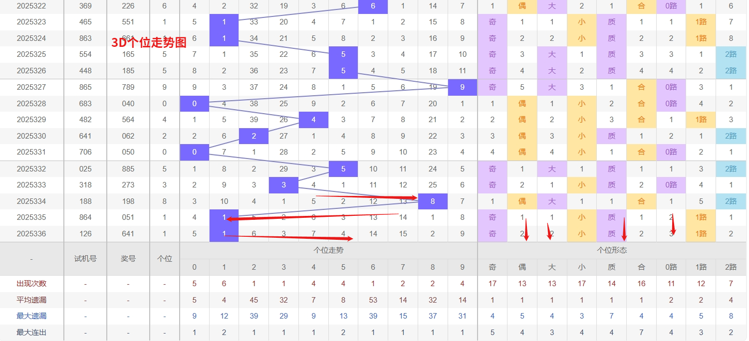 福彩3D个位分析:第2025336期个位开出号码1属于小奇数前端,从以上个位走势图中可以看出近100期的大小比约为47:53奇偶比约为54:46大小奇偶数据上有点差异有需求但不是太明显,不太好看这时就要借助连线走势和遗漏数据来帮助我们缩水号码。上期个位落号“1”小奇数1路号码球,号码开出了0振幅,连续多期的大振必被小振幅取代幅符合我们的预期,那么本期我们在个位考虑振幅走势走前依然要转变思路考虑大振幅,具体考虑(1-5)个振幅是我们主要的方向,那么在对个位落号情况进行系统的分析时我们可以明显的看到个位号码走势呈现大范围震荡,尤其是在号码的落位特点上表现的尤为突出,那么本期我们在个位分析时就要注意号码的风险,避免出现踏空。近期3D个位走势来看,号码2处于明显的冷态,遗漏周期较长,但根据号码均衡回归的规律,冷号往往在持续低迷后存在回补动力,需留意其出现转折的信号。与此同时,号码5和9近期表现强势,热度持续集中,尤其从走势形态与出号节奏来看,两者均具备连开或轮番出现的可能性,应作为当前关注的重点。采取热号为主、冷号为辅的策略,在跟踪热号5、9延续态势的同时,对冷号2的回补可能保持警惕,因此福彩3D第2025337期个位看好02459。本文由一起彩钱是生命动力所著,请勿转载
