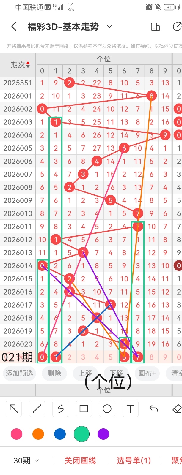 首先,为了感谢各位老板对小梁的关注和打赏,小梁特别提供一个杀个位的小技巧,同尾杀号法,准确率相还可以,但是要记住任何杀号都不能保证百分百准确的哦。小梁根据同尾杀号法,得知本期杀个位1。其次,小梁依照上图中的画线思路可以看出,号码0与前几期开出的号码呈隔六期回补的走势且呈斜三连的走位,跨度6;号码1与前几期开出的号码呈连续隔八期回补的走位且呈斜三连的走势,跨度是5;号码6与前几期开出的号码呈左右斜三连的走势且呈直连回补的走位,跨度0;号码7与前几期开出的号码呈隔九期回补的走位且呈斜三连斜四连的走势,跨度为1。综上所述,小梁根据上图中画线思路分析,本期推荐个位的号码是:0、1、6、7。