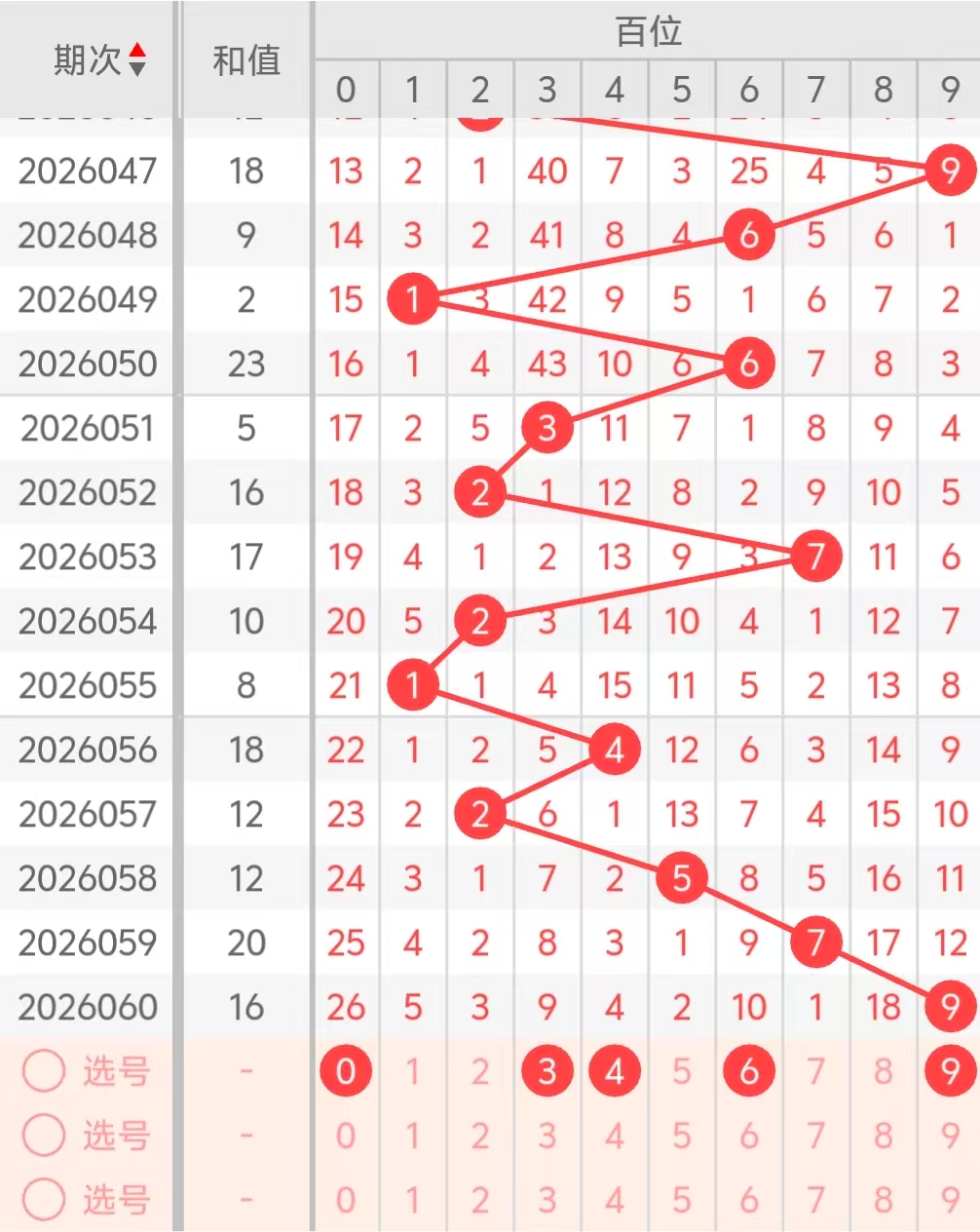 定位5码直选:百位:0-3-4-6-9十位:3-4-6-7-9个位:0-2-3-6-8