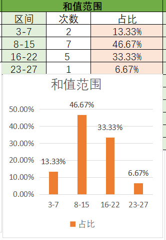 上期和值是12,处在8~15之间,其中8~15占比变大,16~22占比变小。目前是16~228~15占比最优,然后是3~7,最后是23~27。本期看好和值在8~15之间,其次是16~22