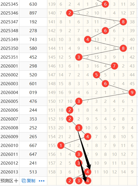 上期跨度为4,近5期跨度开出情况:第26009期开出4,属于偶数,1路号码,金属性;第26010期开出1,属于奇数,1路号码,水属性;第26011期开出3,属于奇数,0路号码,木属性;第26012期开出3,属于奇数,0路号码,木属性;第26013期开出4,属于偶数,1路号码,金属性;
