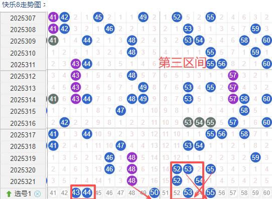 三区间开出了3个奖号(48.52.54)上期回顾三区开出3个奖号上期的三区间的奖号数量呈现一个递减的形态,4头回补1个,本期先来看号码43近期出现频率相对来说还是很稳定。偶尔有时间隔期数也是很长,说明其在近期的开奖中较热的,号码44在近 30 期内出现次数相对还是稳定的号码,近期的活跃度也是较热。号码50有一定的间歇性,通常间隔5-3期会出现一次,没有明显的连续出现态势,走势相对较冷,在整个第三区间的表现本期还是可以防守的。号码53走势相对近期较热,近期没有连续间隔落号的情况,活跃度近期处于较稳定状态注意防守。