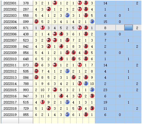 004期开奖号码是099,此时可以看到组选遗漏和值为15,当期期号尾数为4,那么15*4=60,所以在003期就应该排除号码0和6,来到005期开奖号码是871,成功排除号码0和6.