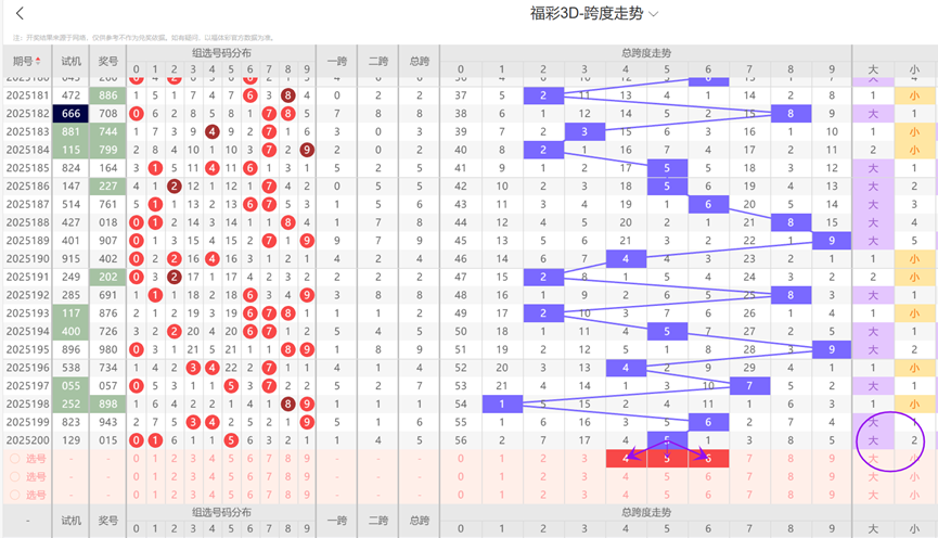 通过观察跨度及跨度属性走势可以发现:近10期内跨度01等号码较少出号,本期跨度大概率不会开出01等号码,因此本期跨度选号时应该优先排除01等号码。结合上述跨度走势图来看,本期跨度看好456等号码。