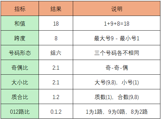 第2025334期开奖号码为 1, 9, 8。具体指标分析如下: