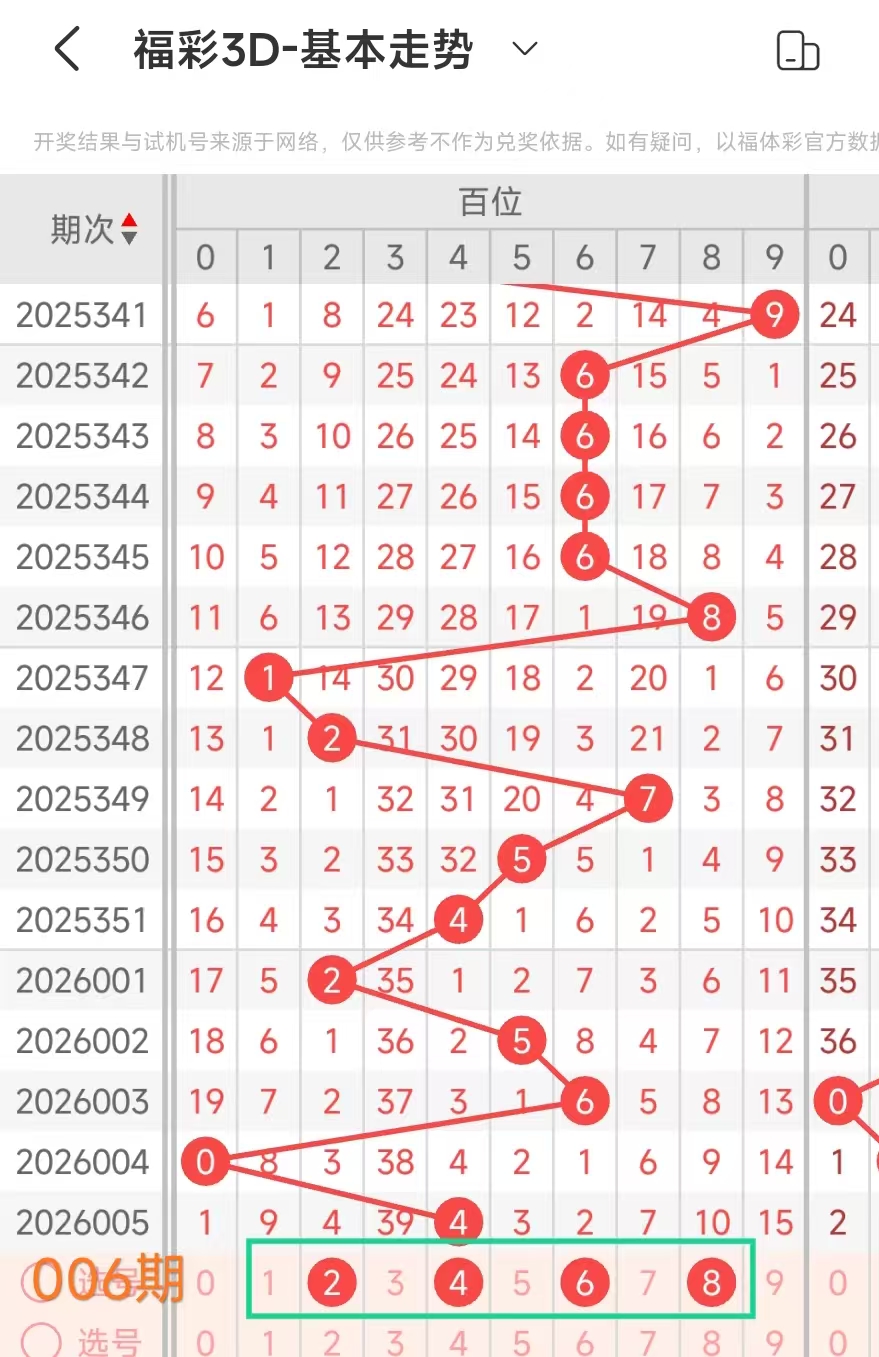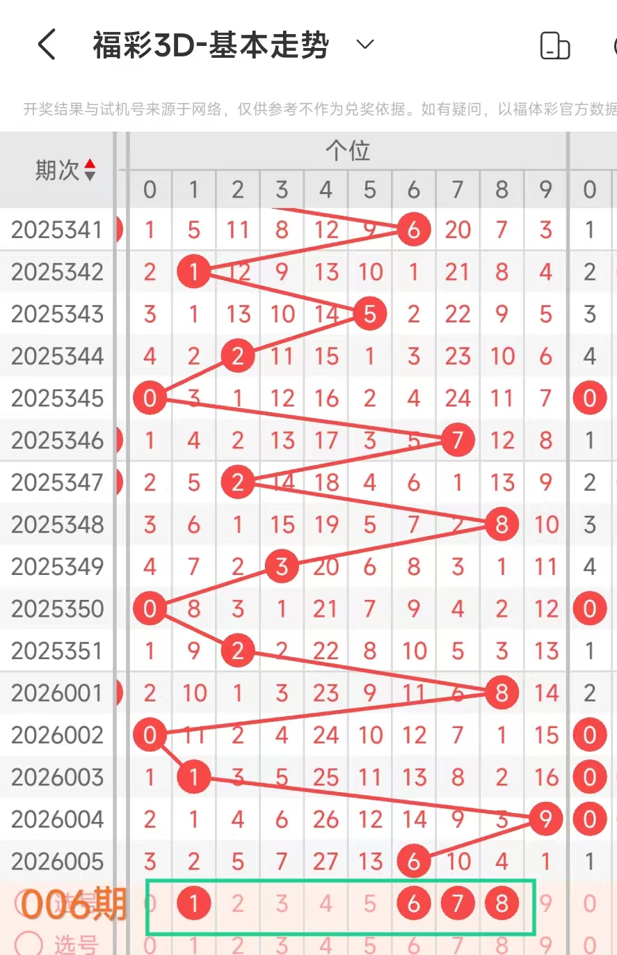 3、当个位开出6后下期开出:53341901,经统计0号出1次、1号出现2次、2号出现0次、3号出现2次、4号出现1次、5号出现1次、6号出现0次、7号出现0次、8号出现0次、9号出现1次。观察发现13号近期没出,本期可以考虑。