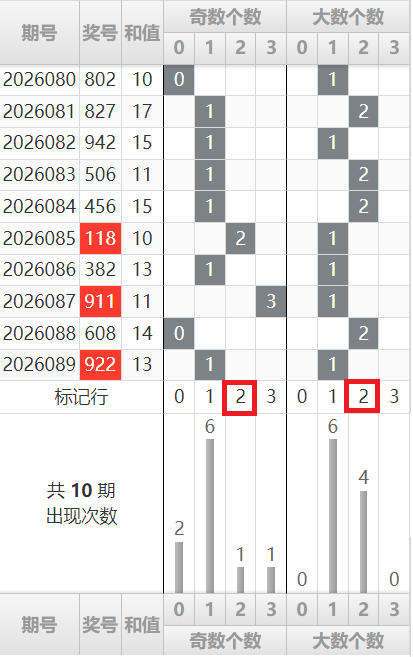 个位上期开出2,是个小数偶数。近期个位偶数出现7次,明显占优。这种极端偏差通常不会持续太久,本期个位迎来奇数回补是大概率事件。