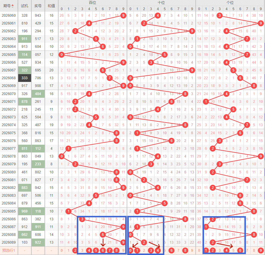 十位上期开出2,这是个小数和2路号码。,最近三期十位是1→0→2,都是小号。本期继续关注小号区域0-4,8码作为温号,有回补需求。