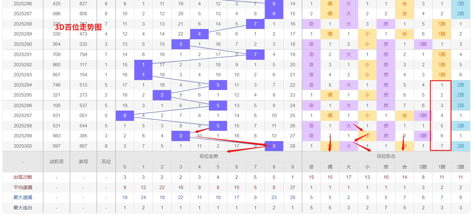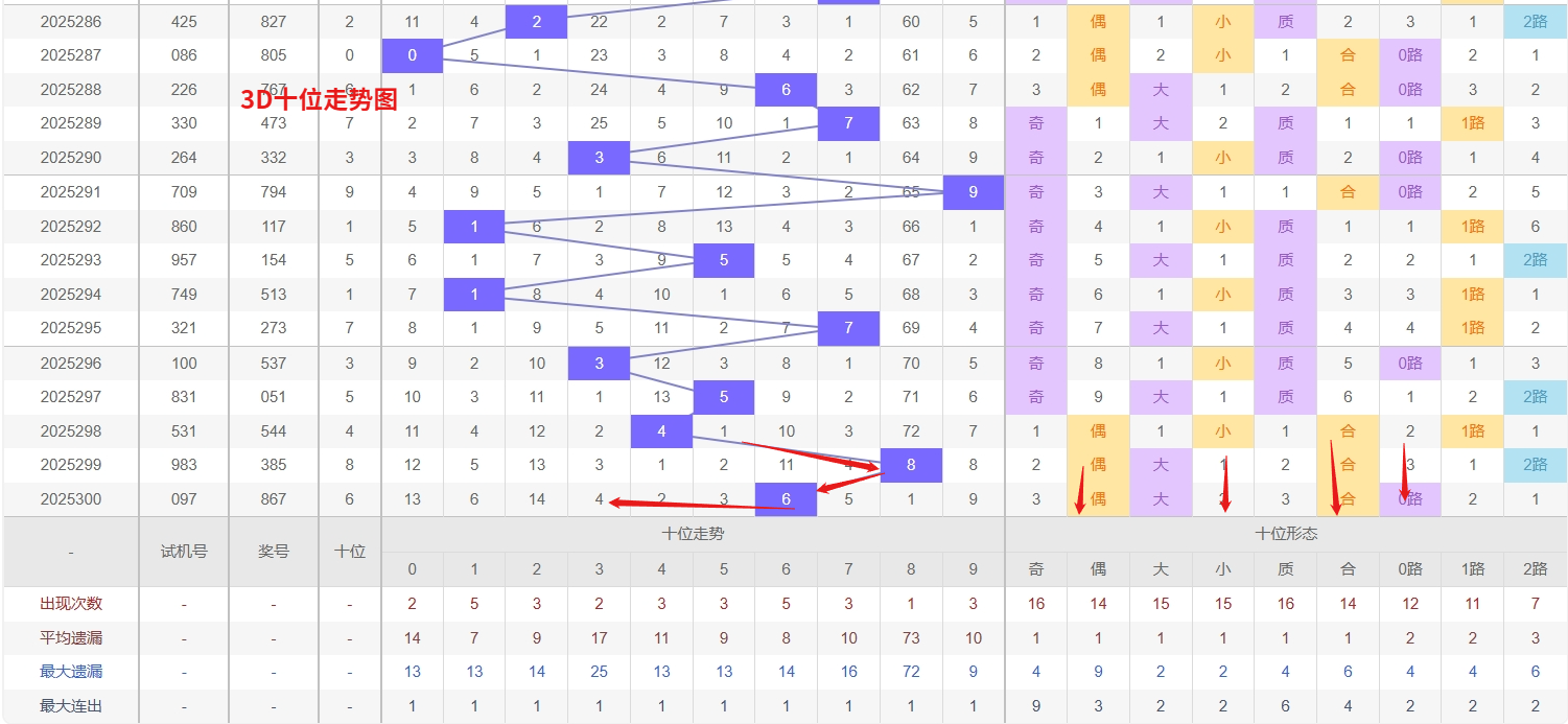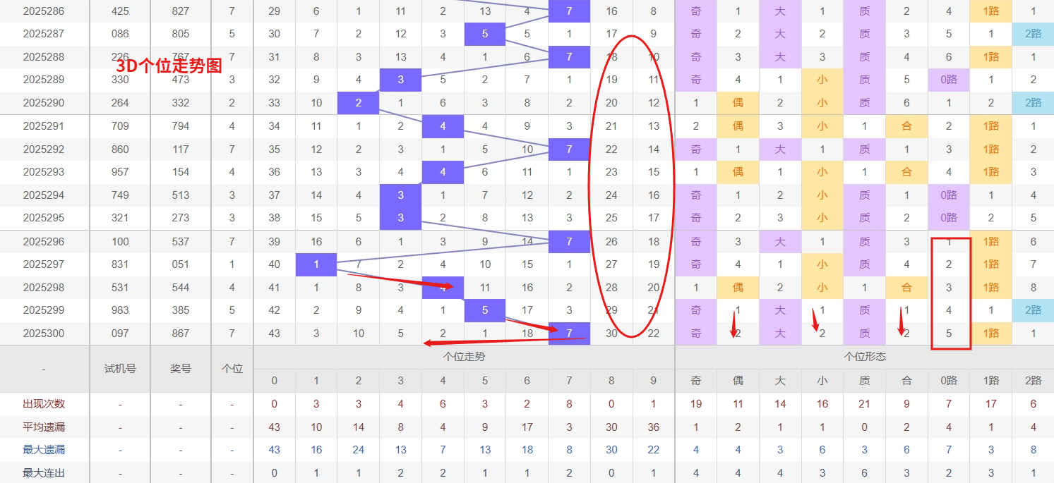 福彩3D个位分析:第2025300期个位开出号码7属于大奇数后端,从以上个位走势图中可以看出近100期的大小比约为48:52奇偶比约为51:49大小奇偶数据上有点差异有需求但不是太明显,不太好看这时就要借助连线走势和遗漏数据来帮助我们缩水号码。上期个位落号“7”大奇数1路号码球,号码开出了2振幅,连续多期的大振必被小振幅取代幅符合我们的预期,那么本期我们在个位考虑振幅走势走前依然要转变思路考虑大振幅,具体考虑(2-5)个振幅是我们主要的方向,那么在对个位落号情况进行系统的分析时我们可以明显的看到个位号码走势呈现大范围震荡,尤其是在号码的落位特点上表现的尤为突出,那么本期我们在个位分析时就要注意号码的风险,避免出现踏空。3D个位近期走势分析,数字0和8均已进入显著的冷态区间,其长期遗漏所积累的回补需求正不断增强,从概率均衡与冷热转换的规律出发,这类深度冷号往往会在市场预期较低时突然反弹,尤其当冷态持续时间突破历史常见阈值后,其解冻回补的动能将更为强烈;与此同时,数字4作为当前明确的热号,其强势表现尚未显示出衰减迹象,在热态惯性作用下仍具备连开可能。采取“防冷追热”的兼顾策略,在重点关注冷号0和8可能出现的回补同时,也需警惕热号4的持续强势表现,因此福彩3D第2025301期个位看好01486。