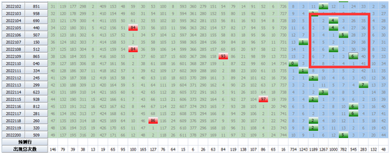 通过上图我们可以发现通过近期数据比对就能找到合跨差的数据空间理,合跨差重复的次数最多为2次,几乎没有3次的时候,从089期到120期整整30期,合跨差仅仅重复了5次,并且从来没有超过3次重复的还是,利用这个指标有排除下期废号,几乎十拿九稳很少出错,一个指标能排除多个单选号码,从1000注号码直接变成700多注,效果还是非常明显的,这个就是合跨差的第一个作用。