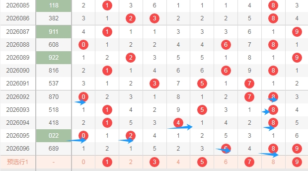 大家好,本人蔡楚门,一个玩彩十几年的老彩民,现在来本平台分享一下本人的对彩票的分析思路和看法,希望本人的文章能够给你们带来灵感和好的运气,首先感谢一起彩提供一个好的平台,下面走势图都是用一起彩平台的走势图,接下来分析一下福彩3D第2026097期号码思路。下面文章中名词解读,合数为0 4 6 8 9,质数1 2 3 5 7,奇数1 3 5 7 9,偶数0 2 4 6 8,1路球数字1 4 7,2路球数字2 5 8,,0路球数字0 3 6 9。下面分析是从左到右定位分析。
