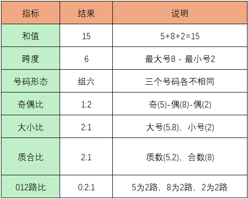 重号分析:近30期有25期出现了至少1个与上期相同的号码(重号),出现频率为 83.3%。上期号码5、8、2中,号码8是近期热号(30期内出现9次)。高概率事件继续支持重号出现。本期可重点关注上期号码 8