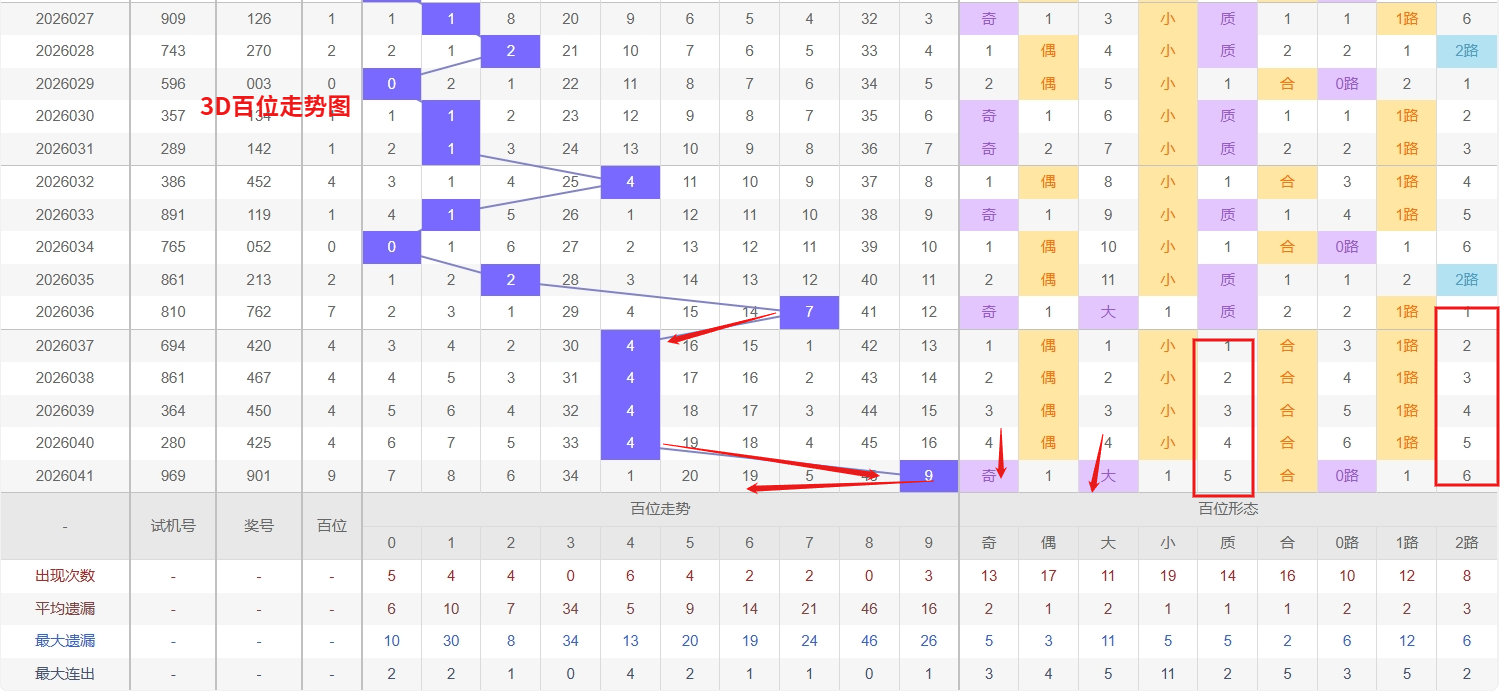福彩3D百位分析:第2026041期百位开出号码9属于大奇数,从上面百位走势图上可以看出近100期大小比约为54:46奇偶比约为51:49。近期数据还是比较极端的符合文章开头介绍的求均衡规律非等量现象。但这种均衡不会持续最终会被偏态运行打破,然后循环往复。但短期内大小相差5点,小数过热大数有回补需求本期个人认为走大数的概率更高。上期百位落号“9”号球,在百位号码开出0路号码9后向大数方向走出5个振幅。那么通过分析上期百位落位号码分析,号码走出5个振幅,号码走为大奇数,开出0路号码9。通过对百位落号趋势来分析,百位号码落位后端,通过对近10期的走势来看百位号码大小交替频繁走2期大数又走3小数,近期3D百位走势来看,数字0持续走热,表现活跃,需防范其热度延续带来再次开出的可能。而号码3和8已多期未见,逐渐进入冷态区间,从历史冷热转换规律分析,冷号在积累一定遗漏后往往具备回补动力,尤其需关注其中一到两个号码可能出现的技术性反弹。整体而言,在关注热号0的持续性的同时,对冷号3和8的回补迹象保持警惕,我们在百位关注的重点在03678这5个号码球上,百位号码近期奇偶切换频繁,9号球码属于0路号码奇数,现奇数开出过多有向偶数的趋势。所以福彩3D第2026042期百位看03678。