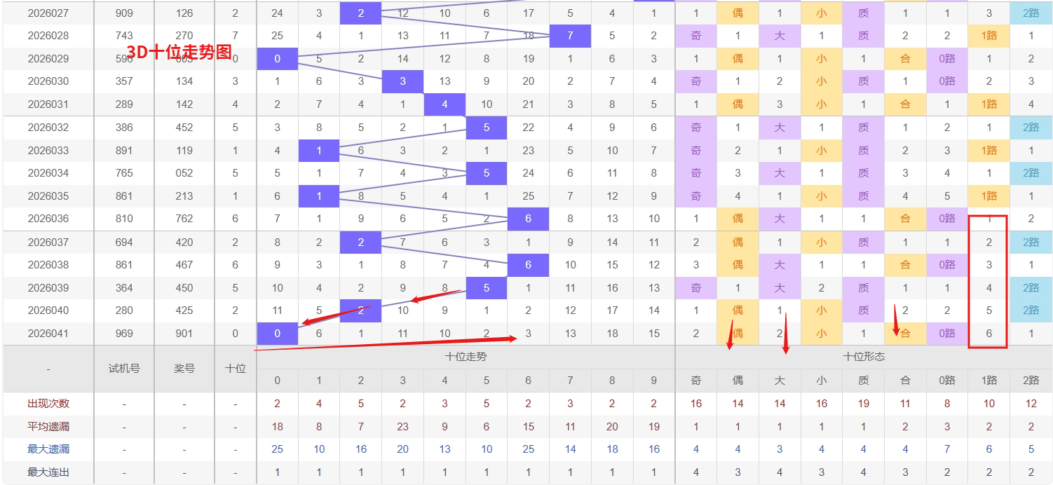 福彩3D十位分析:第2026041期十位开出号码0属小偶数号码前端。以历史100期数据为例十位奇偶比约为48比52,大小比约为55比45近期大小相差2点,根据求均衡的规律开出小数的概率比大数高一点。上期我们分析奇数经过连续回补后有走偶数的可能,开出奖号0小偶数符合我们的预期。近期3D十位走势来看,数字5表现强势,持续走热,其活跃态势显示短期内仍有连下的可能,值得重点跟踪。而号码8和9已进入较长的遗漏周期,逐渐形成冷态,但根据冷热转换的规律,冷号在持续走冷后往往存在技术性回补的需求,此时需警惕其突然反弹。综合在关注热号5的延续趋势同时,对冷号8和9的潜在回补予以适当防守,所以福彩3D第2026042期十位推荐13589。