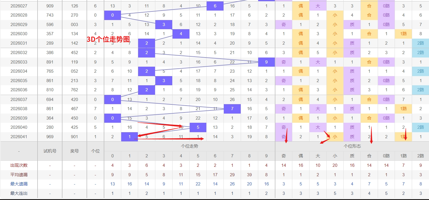 福彩3D个位分析:第2026041期个位开出号码1属于小奇数前端,从以上个位走势图中可以看出近100期的大小比约为48:52奇偶比约为55:45大小奇偶数据上有点差异有需求但不是太明显,不太好看这时就要借助连线走势和遗漏数据来帮助我们缩水号码。上期个位落号“1”小奇数1路号码球,号码开出了4振幅,连续多期的大振必被小振幅取代幅符合我们的预期,那么本期我们在个位考虑振幅走势走前依然要转变思路考虑大振幅,具体考虑(1-5)个振幅是我们主要的方向,那么在对个位落号情况进行系统的分析时我们可以明显的看到个位号码走势呈现大范围震荡,尤其是在号码的落位特点上表现的尤为突出,那么本期我们在个位分析时就要注意号码的风险,避免出现踏空。近期3D个位走势观察,号码9持续走热,表现十分活跃,短期内需重点防范其热度延续带来的再次开出可能。而号码6则已进入明显的冷态区间,遗漏期数较长,从历史数据看,个位冷号在沉寂多期后往往具备较强的技术回补动力。因此当前阶段应在紧盯热号9的强势表现之余,对冷号6的潜在反弹保持足够警惕,适当兼顾冷热平衡的布局策略,因此福彩3D第2026042期个位看好14569。