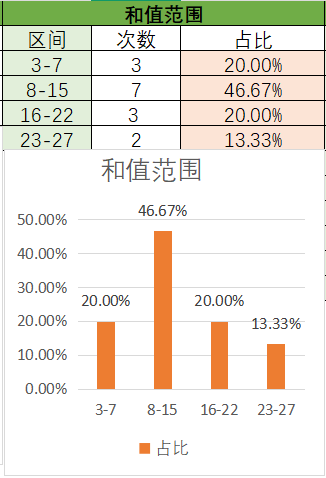 上期和值是23,处在23~27之间,其中8~15占比变小,23~27占比变大。目前是8~15的和值占比是最多的,优势是最好的次之是3~716~22,最后是23~27。本期看好和值在8~15之间,其次是16~22
