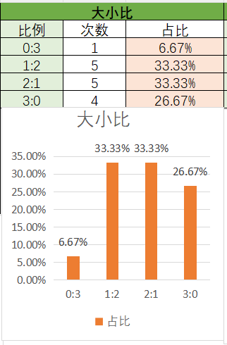 上期大小比为3:0,其中3:0占比变大。2:1占比变小。可以看到近15期内2:11:2优势最好的然后是3:0,最后是0:3。本期看好2:1开出,其次是1:2