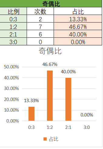 上期奇偶比为1:2,其中1:2占比变大,3:0占比变小。近15期内2:1优势最大,其次是1:2,最后是0:3上期开了1:2奇偶比,本期看好2:1奇偶比的开出,其次是3:0