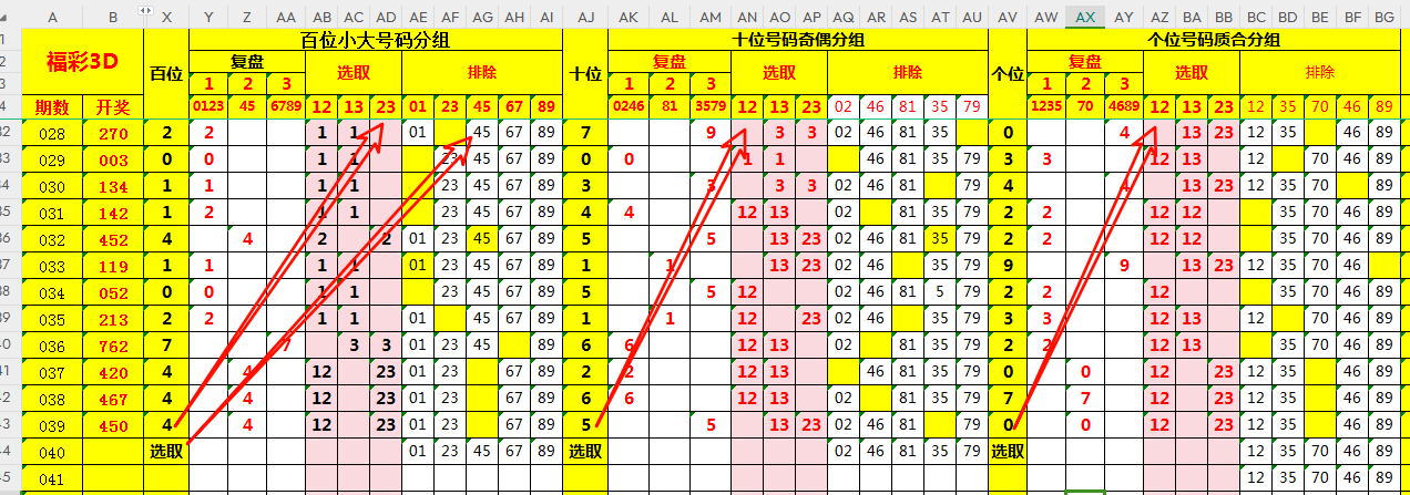 (一)百位号码:小大分组分析 ,一是“复盘”列分区:1区含0123;2区含45;3区含6789; 二是“选取”列并区:12区含0123456;13区含01236789;23区含456789; 三是“排除”列分组: 01 / 23 / 45 / 67 / 89;
