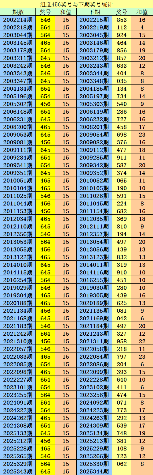 第2025343期3D奖号组选为:456,历史上该号码组选出现60次,下期号码分别为:853、112、924、464、856、857、633、404、035、134、734、540、286、727、458、698、376、477、911、587、374、065、190、591、224、682、369、810、194、497、139、832、319、910、451、280、439、625、081、042、497、327、958、218、797、204、393、640、411、474、071、773、292、539、748、381、108、723、062。