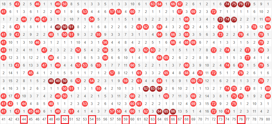 接下来我们一起看走势图,我们把01-40分为前区,41-80分为后区。