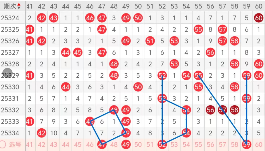 第三区间的走势分析:第三区间上期开出了散个号码球,主要的落号点位在三区间的前半区,走出了一奇两偶的形态走势,上期三区间的前半区落下了两个号码球,后半区落下了一个号码球,整个三区间处于走冷的趋势,根据三区间的走势规律,今天的三区间我们主看前半区47 49组合的落位,47走出了一个正方形的走势形态,49继续上四楼,再看后半区的52 59这两个号码球的落位,52走出了对称的走势形态,59走出了斜连码的走势形态,这四个号球建议大家打四胆拖,或者打四码复三比较稳妥,参考为主!