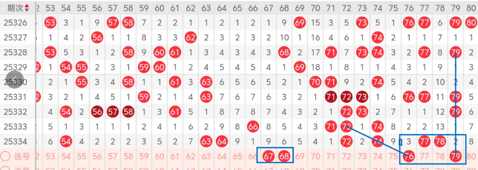 第四区间的走势分析:第四区间上期开出了六个号码球,主要的落号点位在四区间的后半区,走出了两奇四偶的形态走势,上期四区间的前半区落下了两个号码球,后半区落下了四个号码球,整个四区间处于走热的趋势,根据四区间的走势规律,今天的四区间我们主看前半区67 68姊妹对号码的落位,落下的机会很大,特别是67这个号码球,再看76 79组合的落位,也是热码的回补,落下一码的机会很大,主看76这个号码球,这四个号球建议大家可以两两组合,也可以打个四胆拖,或者打个四码复三比较稳妥,参考为主!