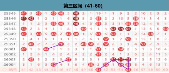 本区上期开出5码的区间布局,那么在本期我们优先考虑的就是52 55的同路的出号点位,45 50的同形态的出号点位,还有就是45 55的同尾的出号点位,在这个位置上我们要考虑一码的出号的可能性,选则45的下方出号就是放空45 55的位置的出号,但是选择50的下方出号,那么在55的下方就是我们要考虑出号的重点位置,在空位上我们要关注的就是小周期的出号点位,在41 42 47 57的号码选择上我们做择一出号的选择,在温冷上我们也是要做择一出号的可能性的,那么其他位置的出号就不是我们考虑的重点位置了。