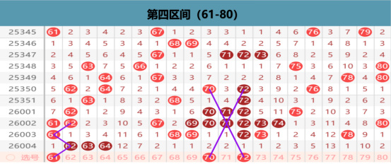 本区上期开出3码的区间布局,那么在这个位置上,我们优先考虑的就是形态的不空,那么在形态的点位上我们优先考虑的就是三重号下方的出号点位,62 63 64我们做择一出号的选择,那么在空位上我们关注的就是三同路放空的出号定位,69 72 78的下方我们选择一码的回补机会,优先考虑的就是分边的出号位置,在68 78同为放空的点位上,我们也是选择一边的下方的回补重点,断头区间,这个区间上的号码理论来说都不会太多,我们选择1-2码的出号作为重点出号的布局,其他位置的出号就不是我们考虑的重点方向了。