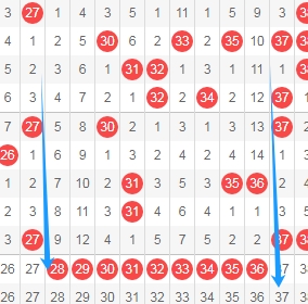 上图是福彩快乐8开奖号码走势分布图其中一部分,我标志出来的数字一共有9个,这9个数字上期一个数字都没出现,最近两期这个区域出号码也只开出了一个数字31,看这个区域上面的范围,最近这个区域不号码也不多,那么本期这个区域的数字可以考虑出3个或者4个吧,个人最看好数字28 30 32 33 34。