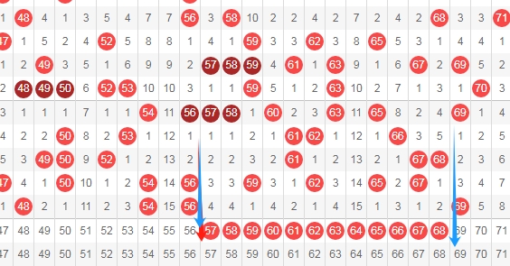 上图是福彩快乐8开奖号码走势分布图其中一部分,我标志出来的数字一共有12个,这13个数字上期只开出了一个数字,那么本期这个区域的数字可以考虑出3个或者4个吧,个人最看好数字57 60 63 64 66 68。
