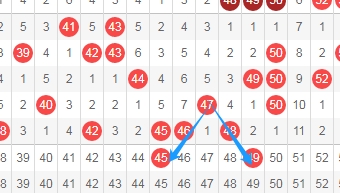 上图是福彩快乐8开奖号码走势分布图其中一部分,我标志出来的数字45和数字49都是斜连号码走势,数字45一直从数字47斜连下来,数字49一直从数字47斜连下来,福彩快乐8一般喜欢出斜连号码,这两个数字你们看好不?