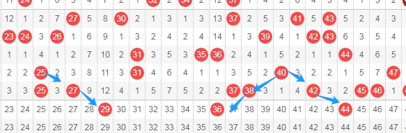 上图是福彩快乐8开奖号码走势分布图其中一部分,我标志出来的数字29 36 44都是跨度二斜连走势号码,数字29一直从数字25跨度二斜连下来,数字36一直从数字40斜连下来,数字44一直从数字40斜连下来,那么这几个数字你们看好不?
