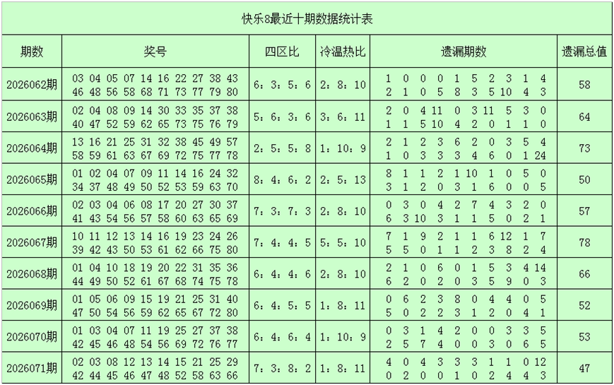 一、快乐8第2026072期奖号分析(定义:遗漏0-2期号码为热码,遗漏3-6期号码为温码,遗漏7期及7期以上号码为冷码,重码为上期开出奖号,邻码为上期没有出现,但与上期奖号差值为1的号码,例如上期开出奖号04,没有出现号码03和05,则本期03和05都为邻码,其它则为孤码。