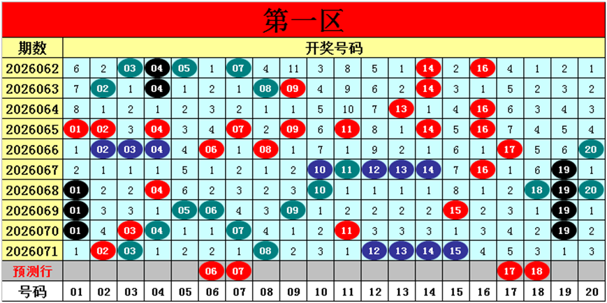 目前第一区包含15个热码:重码7个02、03、08、12、13、14、15,邻码5个01、04、07、09、11,孤码3个05、06、19;包含5个温码:邻码2个16、20,孤码3个10、17、18;包含0个冷码;号码冷温热个数比为0:5:15,重号、邻码、孤码个数比为7:7:6。