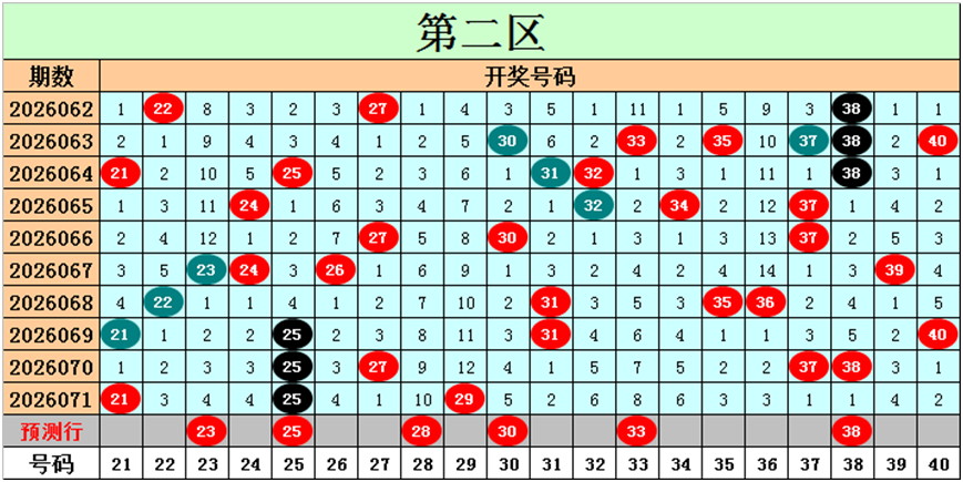 目前第二区包含8个热码:重码3个21、25、29,邻码0个,孤码5个27、31、37、38、40;包含10个温码:邻码4个22、24、26、30,孤码6个23、32、34、35、36、39;包含2个冷码:邻码1个28,孤码1个33;号码冷温热个数比为2:10:8,重号、邻码、孤码个数比为3:5:12。