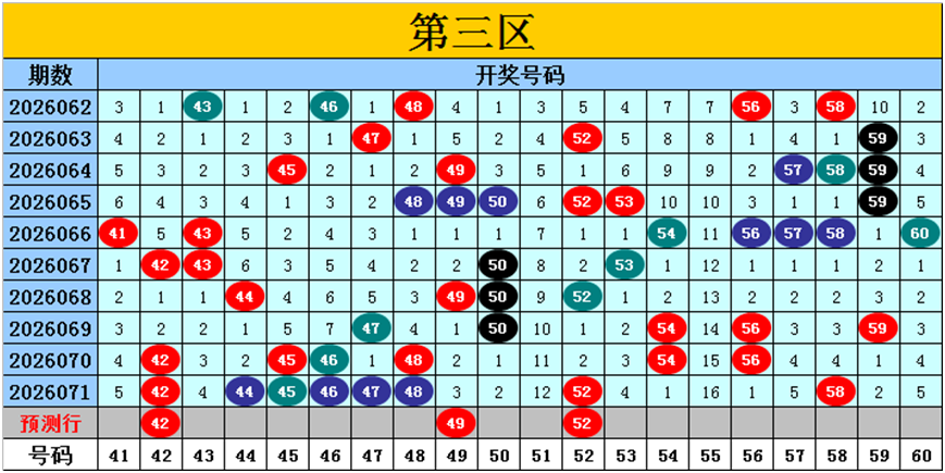 目前第三区包含12个热码:重码8个42、44、45、46、47、48、52、58,邻码1个59,孤码3个50、54、56;包含6个温码:邻码5个41、43、49、53、57,孤码1个60;包含2个冷码:邻码1个51,孤码1个55;号码冷温热个数比为2:6:12,重号、邻码、孤码个数比为8:7:5。