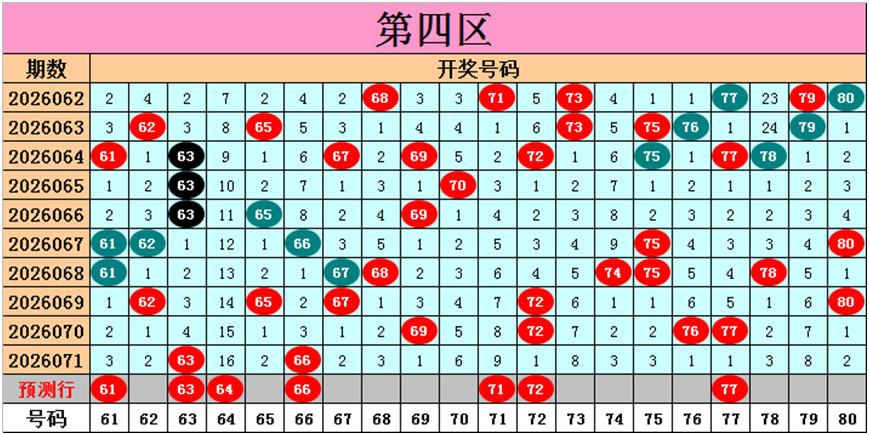 目前第四区包含10个热码:重码2个63、66,邻码3个62、65、67,孤码5个69、72、76、77、80;包含6个温码:邻码0个,孤码6个61、68、70、74、75、78;包含4个冷码:邻码1个64,孤码3个71、73、79;号码冷温热个数比为4:6:10,重号、邻码、孤码个数比为2:4:14。
