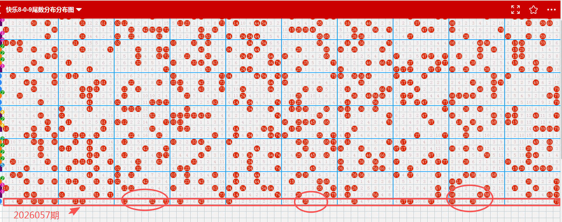 上图是快乐八2026057期的尾码走势图,从图中看0尾到9尾出号个数依次是:0尾号码区开出4个;1尾号码区开出2个;2尾号码区开出3个;3尾号码区开出2个;4尾号码区开出1个;5尾号码区开出1个;6尾号码区开出1个;7尾号码区开出3个;8尾号码区开出2个;9尾号码区开出1个;再看小尾号码(0尾-4尾)区有12码,大尾号码(5尾-9尾)有8码;数据比对统计后可以看到本期0尾出号数量最多,一共开出了4个中奖号码。本期没有尾区出现断区!由走势比对推断2026058期重点需要关注2、5、8尾区号码下号热度回补和落号数量增加的概率较大。