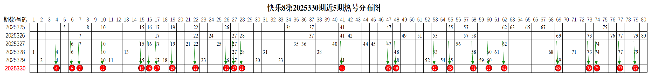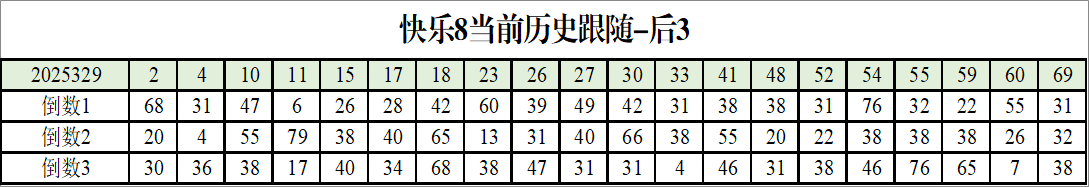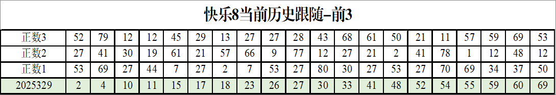 我感觉选热的同时,还要注意防冷条件开出,可以直接选取每个号码跟随出次前三的号码,也可以考虑把出次最后的三个数字加进去,不过这样可能号码太多,可以尝试。图上也能看出单独号码跟随的情况,我就不一一统计每个号码的出次了,我这里考虑提高概率,取每个号码历史跟随的前三号码和后三号码,根据2025329期的号码,我关注正数3和倒数3的号码号码为: