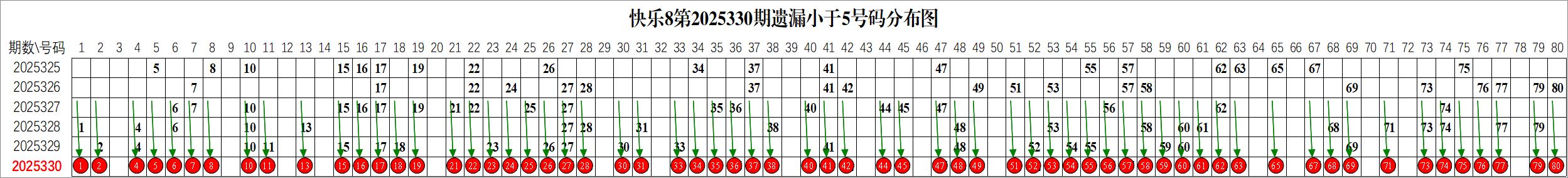 所以这个条件值得关注,从号码分布图上我们可以分析出,遗漏小于5期的号码有: