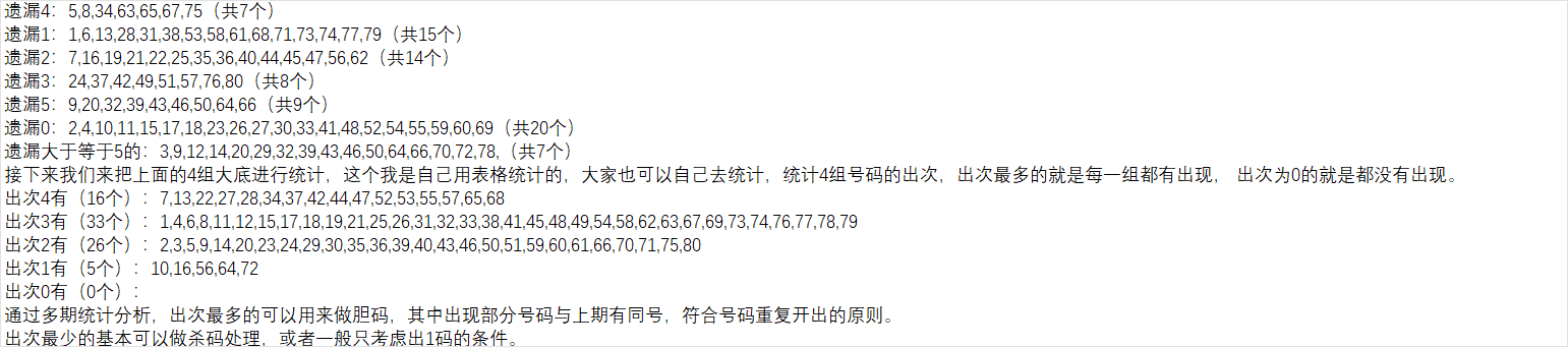 我的基本思路是通过号码尾数情况,取出6尾相关的号码作为第一组大底,然后统计号码跟随的情况分析出第二组大底,通过短期遗漏分析形成第三组大底,再按照对数补数分析统计出第四组大底(根据情况可能实时增加其他大底 ),最后把这些大底进行统计,重点关注出次最多的号码,搭配出次少的号码,灵活组号,形成本期精选胆码。