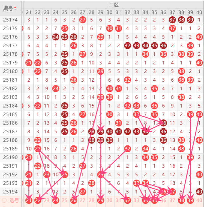 二区在近期的走势上来看,整个区间走热的形态,上期二区间再次开出了平均4码,而且整个区间上期开出的形态是斜连号和重码空位回补走势,上期二区间小妹在文章中布局到了2码开出,那么本期还是注意重码回补上的21.30.中开出一码机会,至于重码上注意防守40走重带39号开出机会,而本期对称形态上的21.30.33.31.39中关注2码开出机会,而隔期回补的33.34.中防守一码开出机会,如图所示.