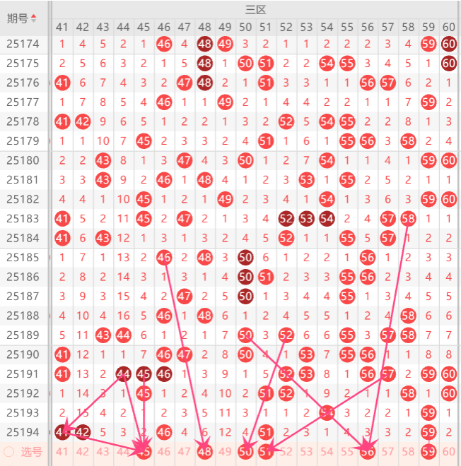 三区间在近期的走势上分析,上期三区间区开出了5码,而且整体区间开始走温热形态,上期三区间开出的形态是重码回补和重码走势,而上期小妹在文章布局到了3码开出,那么本期在连号下布局一码走重,而46.51中也要注意一码走重机会,防守一码分边,个人建议。大家自己参考,至于重码回补上的45.53.55.56.中防守1-2码回补机会,本期还要注意59号这里防守59走三重机会,切记一定要做防守机会,如图所示。