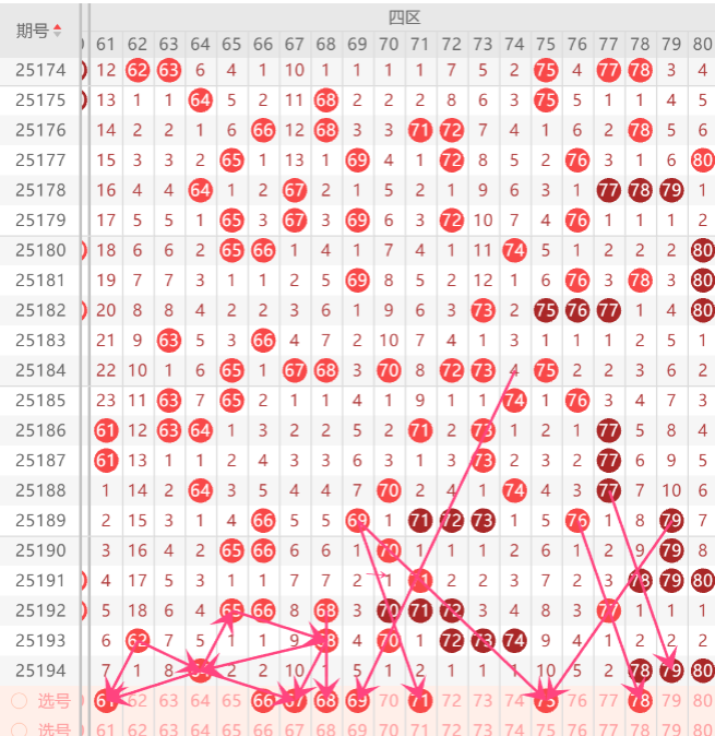 四区在近期的走势上来判断机会的话,整体区间还是一个温冷走势,上期四区间开出了4码,而上期区间开出的形态是空位回补和三连号走势,上期在文章中布局到了1码开出,那本期首先注意重码回补上的61.68.70.72中防守1-2码回补机会,至于三连号下注意防守1-2码走重一码分边机会,而隔期回补上防守73.68中开出机会,至于孤码62号隔期分边上防守61.63中开出而四区间的斜连号下拉位置上的隔期回补上75号注意防守机会,切记做防守即可,如图所示。